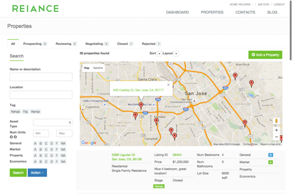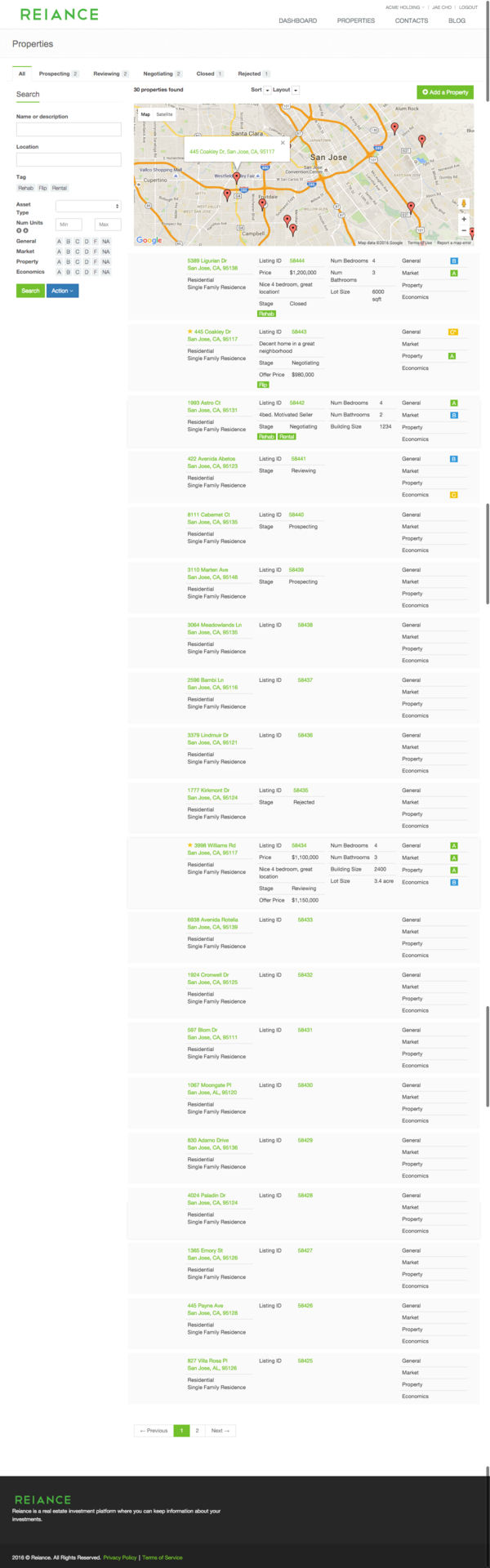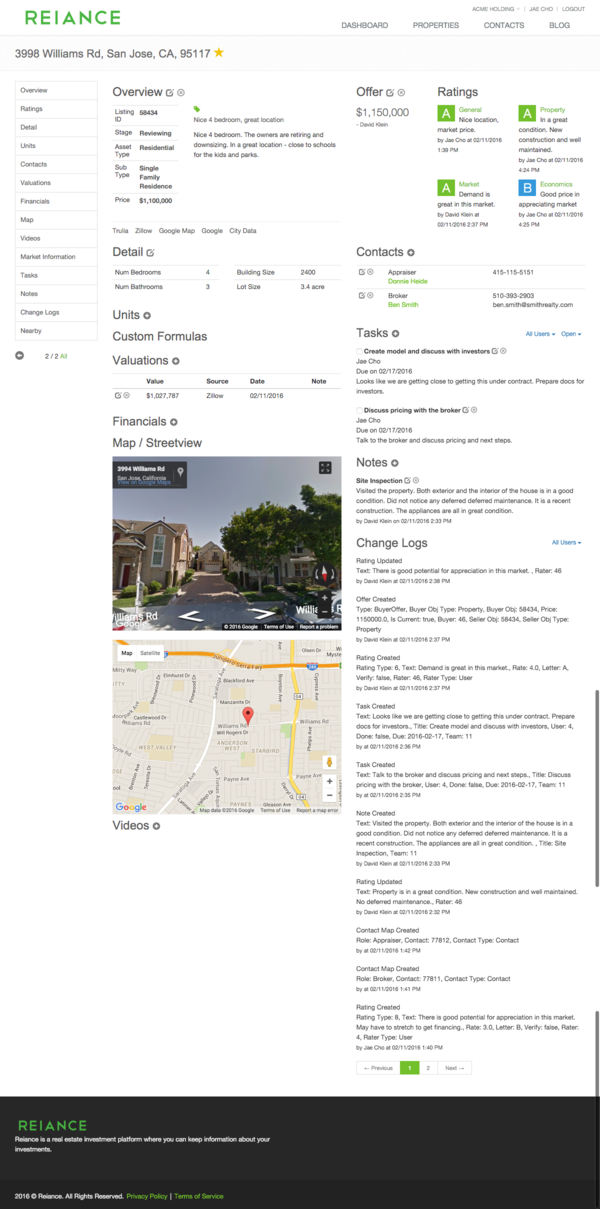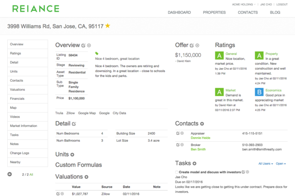 Effective organization of deal information is essential to a successful real estate business. Using Reiance, you can manage various property information in a single location, including pricing, ratings, notes, contacts, links, history, and more.