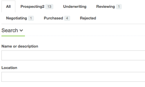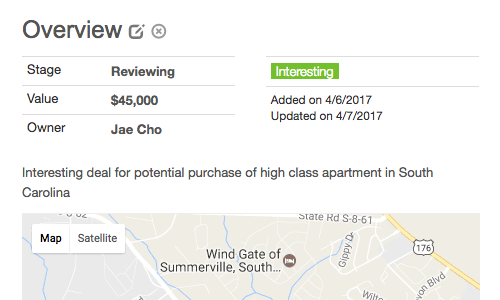 Once you add real estate properities to a deal, you can search by location of the properties. You can easily access deal by location.